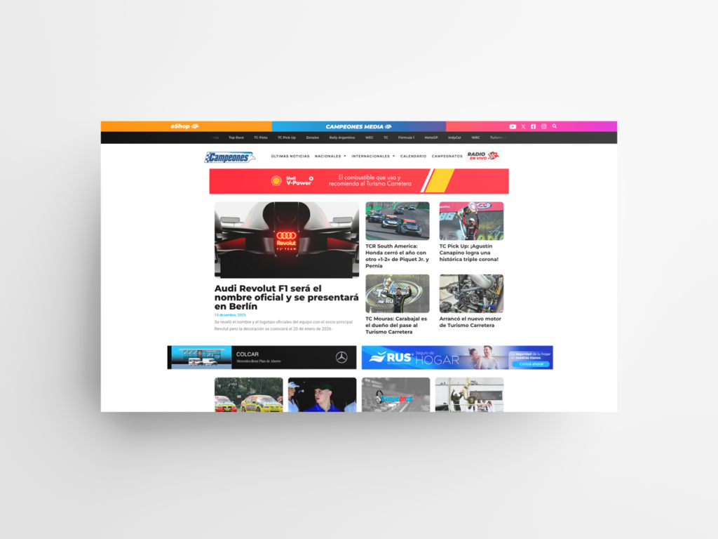 Desarrollo para Revista Campeones. E-commerce, integraciones multimedia – Campeones TV & Campeones Radio y Podcast.